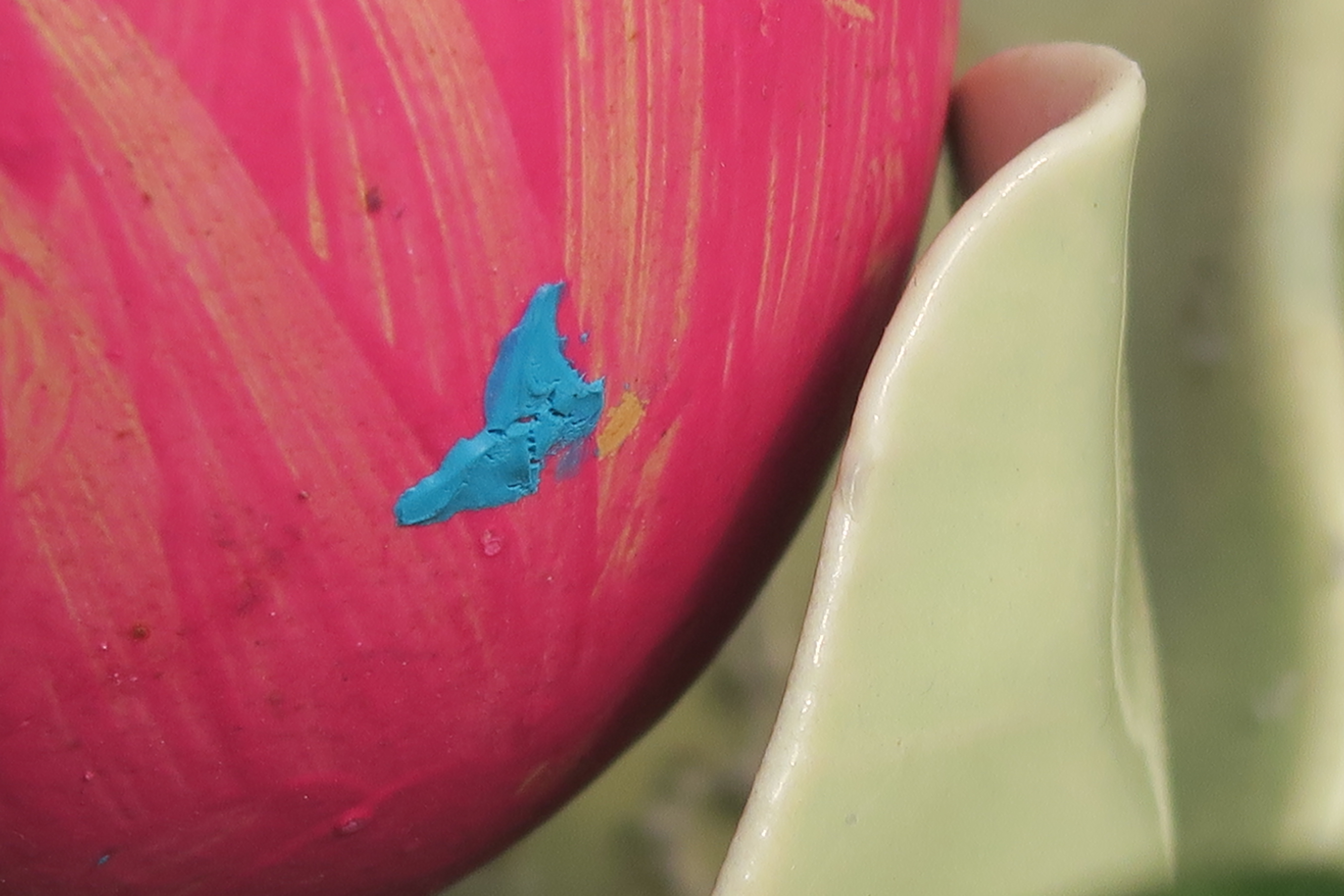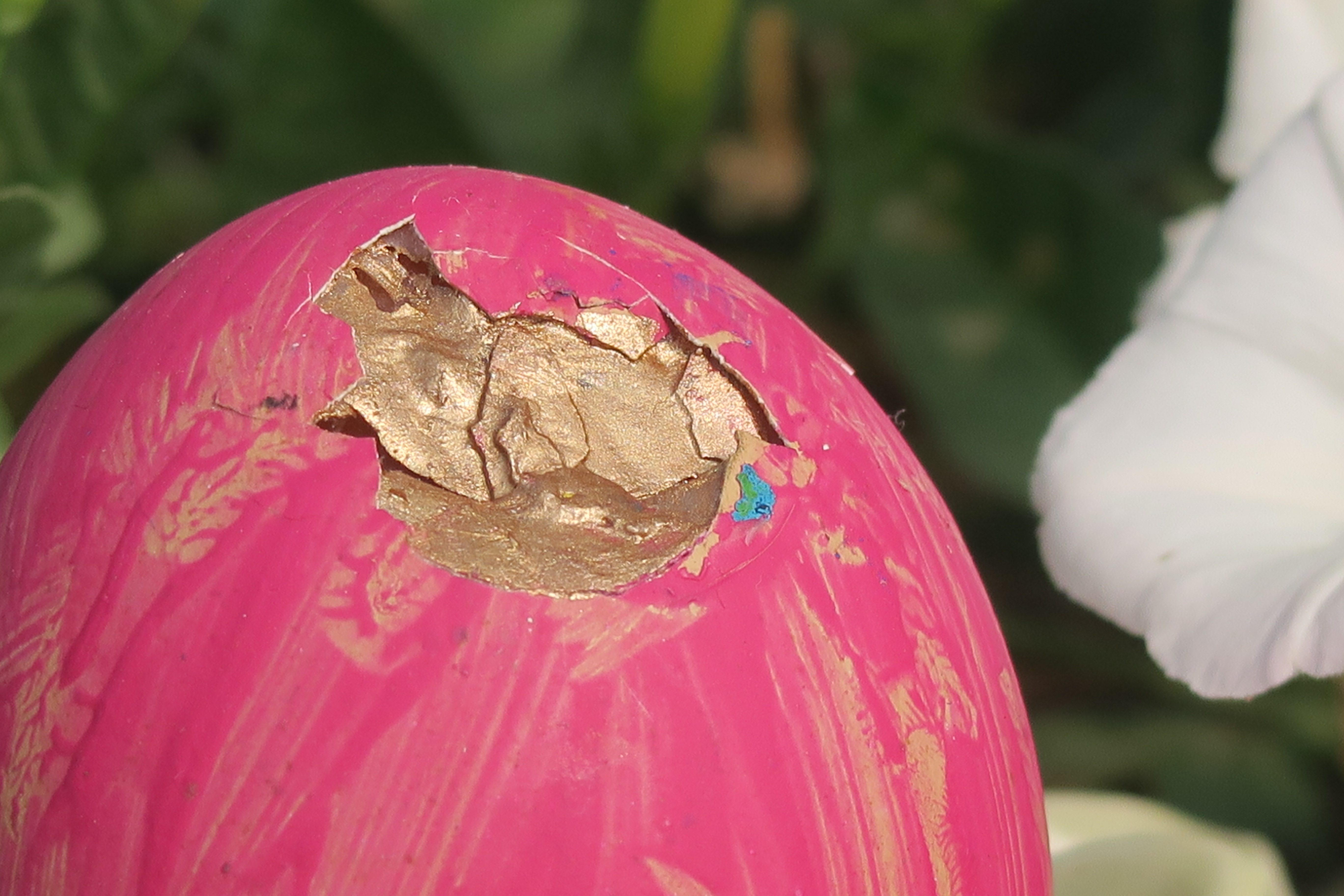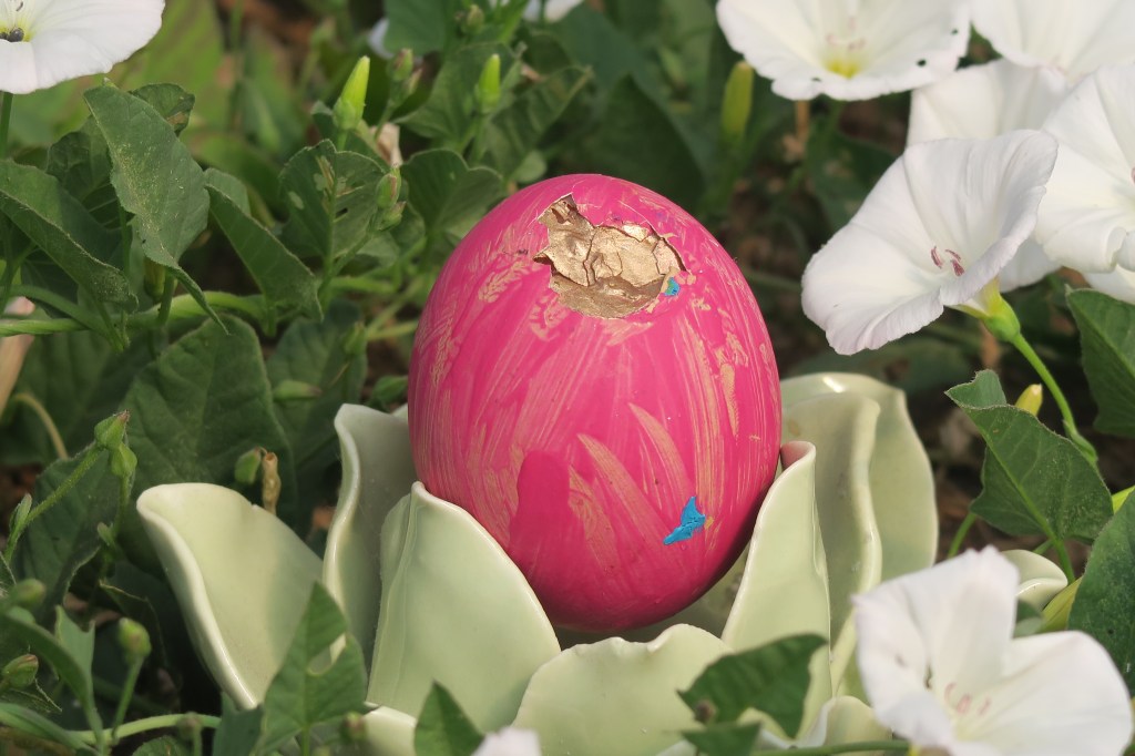 Medium: Acrylic paint and gold paste on natural egg. Sits on green lotus flower.